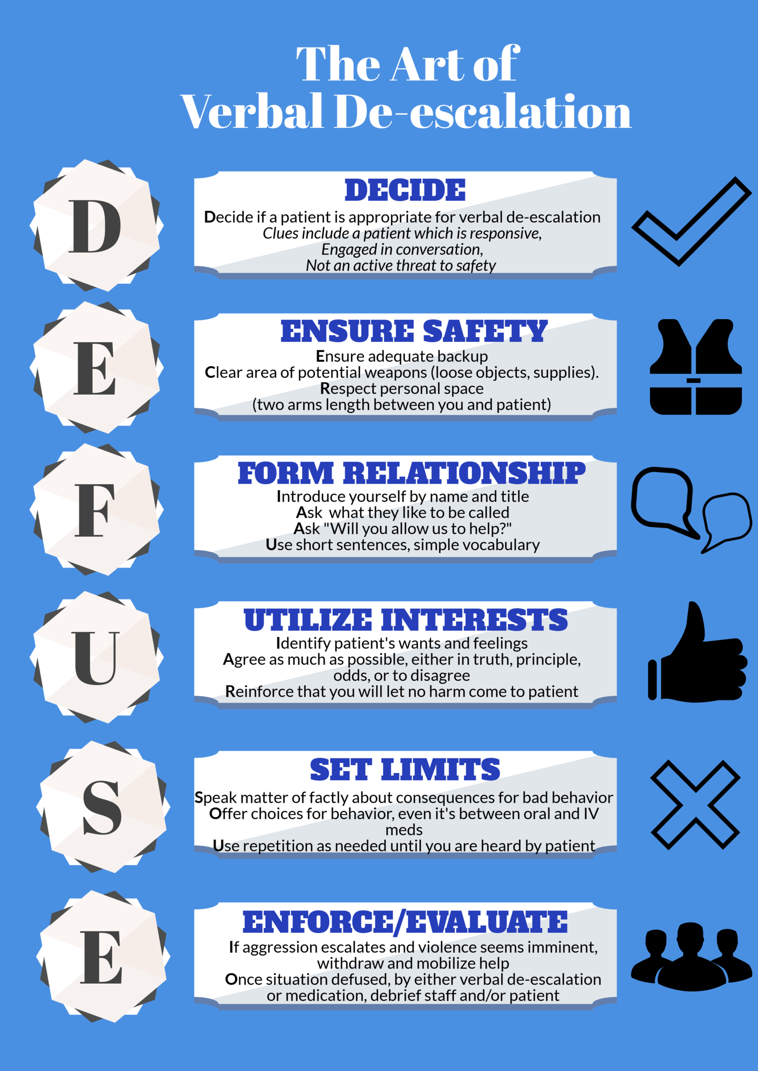 This is a useful blogpost on the psychology today platform that targets the emotional crisis de-escalation context. For those interested this would be a must-read for those encountering emotional crises. It also provides a clean aesthetic and clear communication of these concepts, useful for those wanting to produce forward-facing de-escalation material.